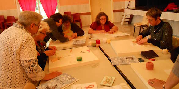 | Nicole donne les premiers conseils pour un premier cours. | Chantal donne les conseils pour la polychrome de Courseulles. | Marie-Claude surveille la bonne marche du travail. |
