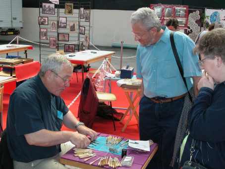 Là, ça commence à bousculer... On fait une petite pause pour bavarder avec Madame Piotte, une dentellière qui réalise de merveilleuses ombrelles en dentelle. Elle les exposera les 9 et 10 juillet 2005 à Creully, pour la rencontre internationale. |